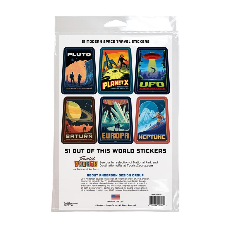 Blast off on a thrilling journey to the stars with our fabulously retro Space Travel stickers! 51 vintage-style sci-fi designs are perfect for decorating journals, water bottles, laptops, and more.